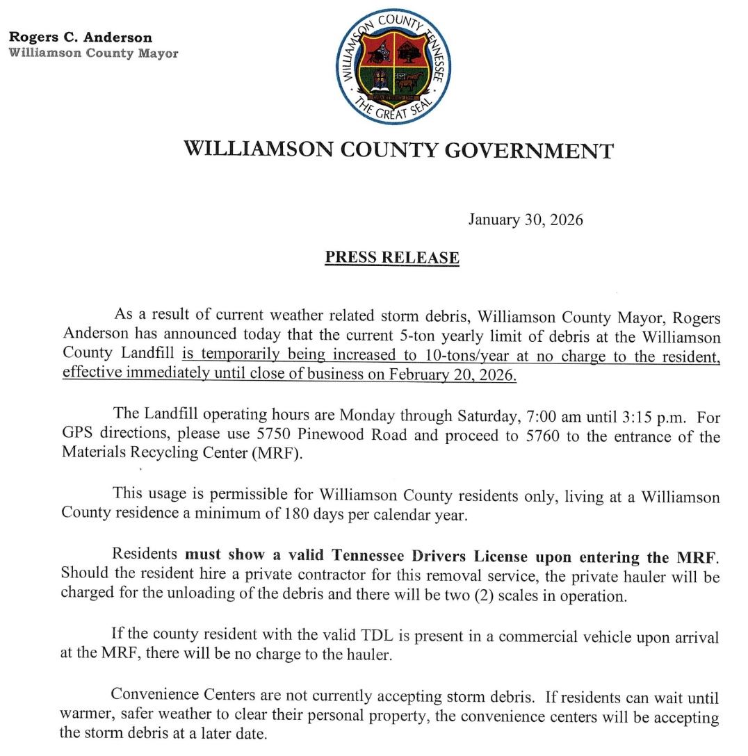 PRESS RELEASEAs a result of current weather related storm debris, Williamson County Mayor, RogersAnderson has announced today that the current 5-ton yearly limit of debris at the WilliamsonCounty Landfill is temporarily being increased to 10-tons/year at no charge to the resident,effective immediately until close of business on February 20, 2026.The Landfill operating hours are Monday through Saturday, 7:00 am until 3:15 p.m. ForGPS directions, please use 5750 Pinewood Road and proceed to 5760 to the entrance of theMaterials Recycling Center (MRF).This usage is permissible for Williamson County residents only, living at a WilliamsonCounty residence a minimum of 180 days per calendar year.Residents must show a valid Tennessee Drivers License upon entering the MRF. Should the resident hire a private contractor for this removal service, the private hauler will becharged for the unloading of the debris and there will be two (2) scales in operation.If the county resident with the valid TDL is present in a commercial vehicle upon arrivalat the MRF, there will be no charge to the hauler.Convenience Centers are not currently accepting storm debris. If residents can wait untilwarmer, safer weather to clear their personal property, the convenience centers will be accepting the storm debris at a later date